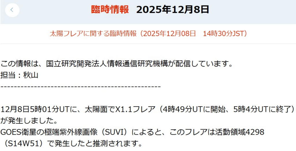 昨日も、Xレベルの太陽フレア発生の臨時情報が届いた。