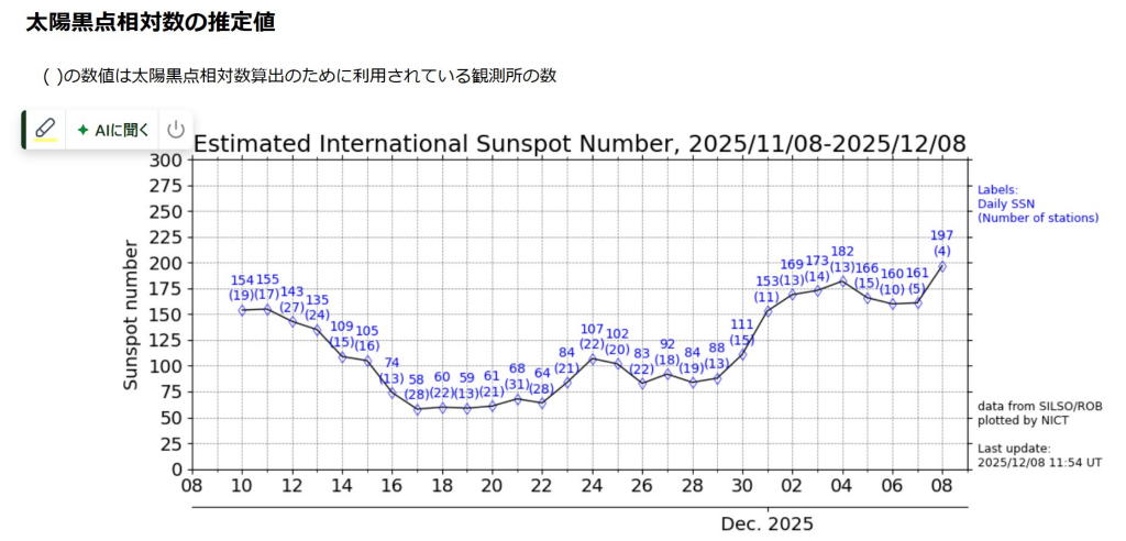 太陽黒点の相対数が異常な程の高まりを示しており、これが太陽フレアが頻繁に発生する原因となっているようだ。