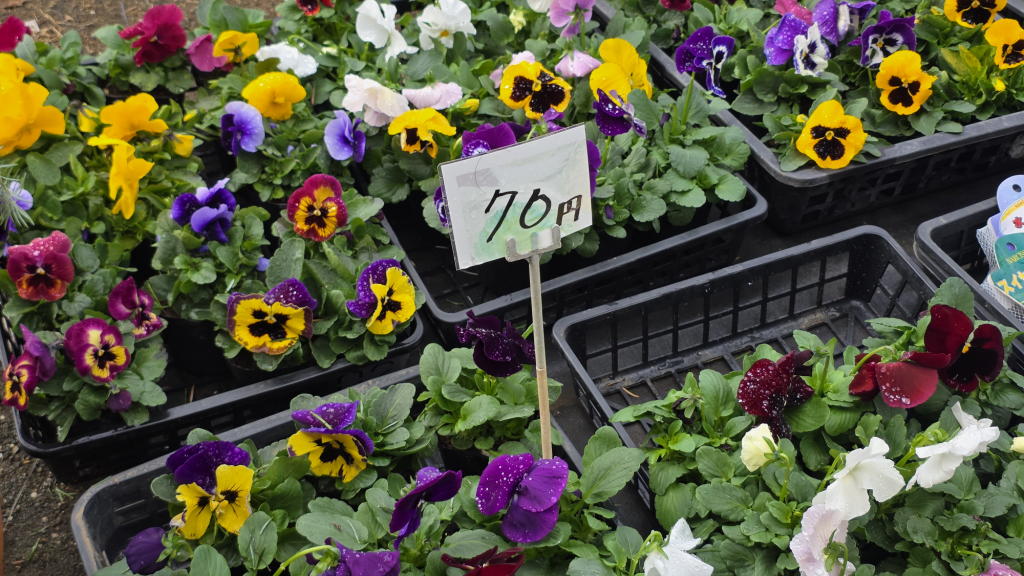 美しいパンジーが1ポッド(鉢)70円で販売されていた。